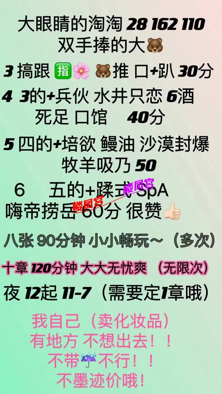 楼凤宫紧急通知:最近冒出许多假APP,宣称美女同城外卖,却是骗充值! 或者以‘QQ聊黄容易封号’为由,要你下载安装安卓APK,却是套你充值! 充值之后血本无归,根本没有妹子! 死骗子们又声称让你再次充值就可以退款前一次的充值,实际上却是骗你充值更多!约妹前必看此联系方式是否名列 本站的“骗子专贴”(全网独一无二!每天更新)!